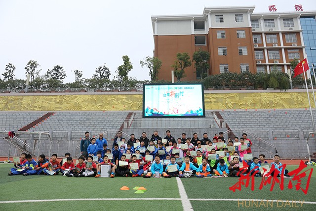 怀化市足球运动协会2015-2017 年举办二级裁判员培训班 3 期,国家一级裁判员培训班 1 期。2016,2017 连续两年承办了湖南省足球协会湘甲联赛小祖赛,8 强决赛,4 强决赛。2017 年承办教练员湖南省足球协会D 级训班 2 期共 120 人次(含预备班)。图为开营仪式现场,主办方给学生颁发奖品。