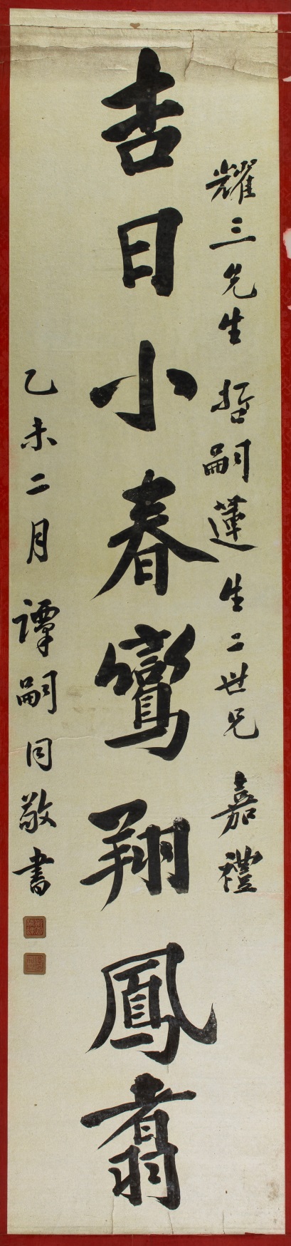 这幅用泥金纸写的对联尺寸有161x35x2cm,是谭嗣同流传至今的书法作品中为数不多的大尺寸,谭嗣同题字“吉日小春鸾翔凤翥,德门佳耦璧合珠联”,喜庆祥和之意溢于言表。特别的是,谭嗣同落款于上联,上款人为“耀三先生哲嗣莲生二世兄嘉礼”,“乙未二月谭嗣同敬书”,落于下联的款识为“卫克强率子不群、不磷,孙定一、定甲敬贺”。事实上,这幅喜联为卫克强托谭嗣同写,献给耀三先生之子莲生的新婚嘉礼,因此谭嗣同特将下联落款人的位置留给卫克强,自己则敬贺于上联落款处,并有钤印“谭嗣同印”、“检园精刻”。
