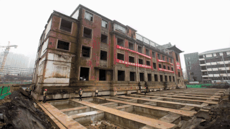 具有64年历史的湘江宾馆中栋建筑整体成功向北平移35.56米,实现国内砖柱独立基础最大古建筑平移的纪录。这也是湖南首例文物整体平移项目。 记者 郭立亮 摄