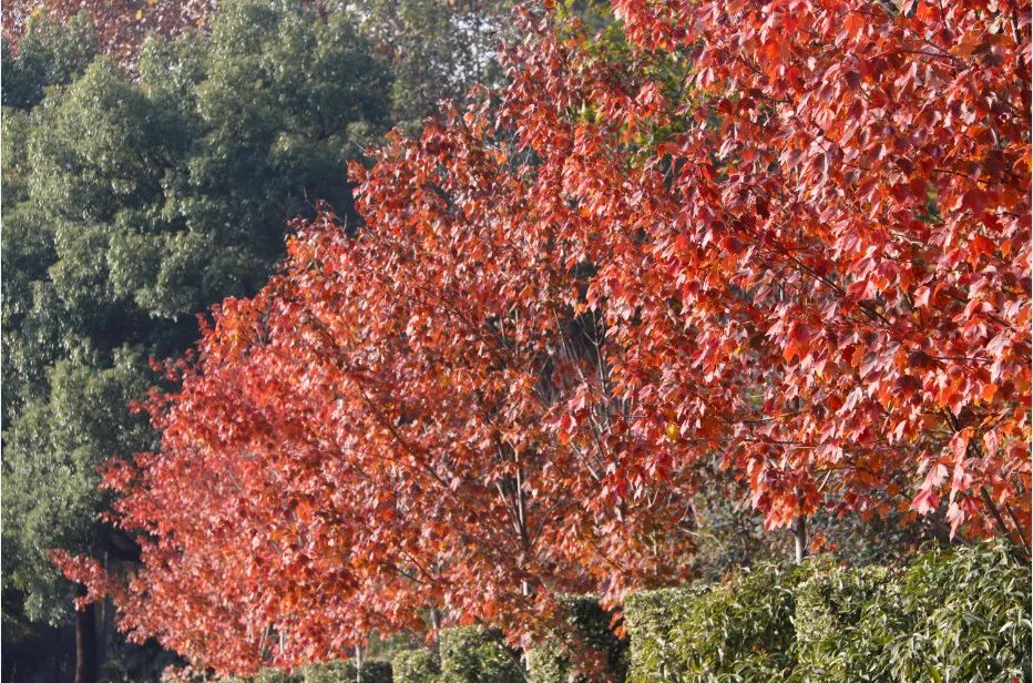 近百株北美红枫在阳光下显得格外耀眼,宛如身披红色制服的侍卫门微笑的迎接着过往的游客,从北门入口一直红艳到东门,让人不禁陶醉在这迷人的景色中。
