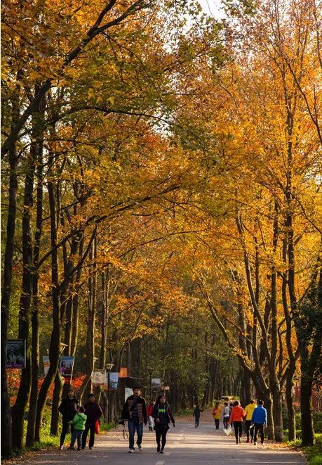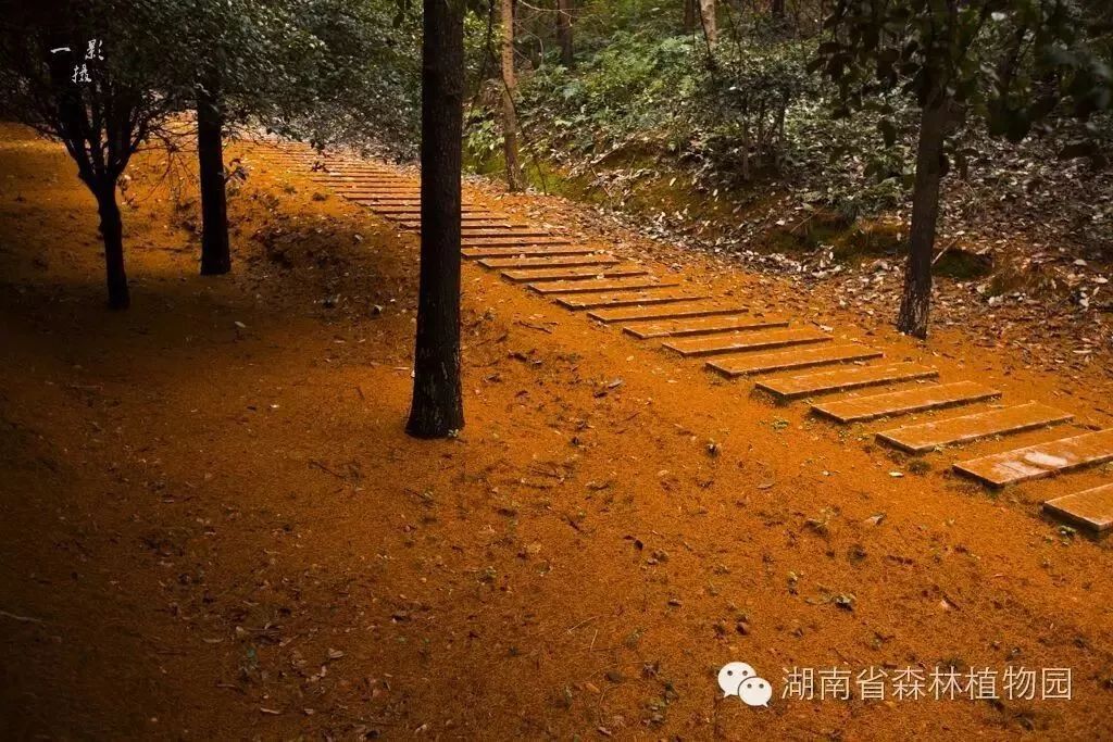 树形优美的国家二级保护植物金钱松,条形的叶片早已变成了金黄,道路已经被铺上一层满满的松叶,像极了金色的地毯。