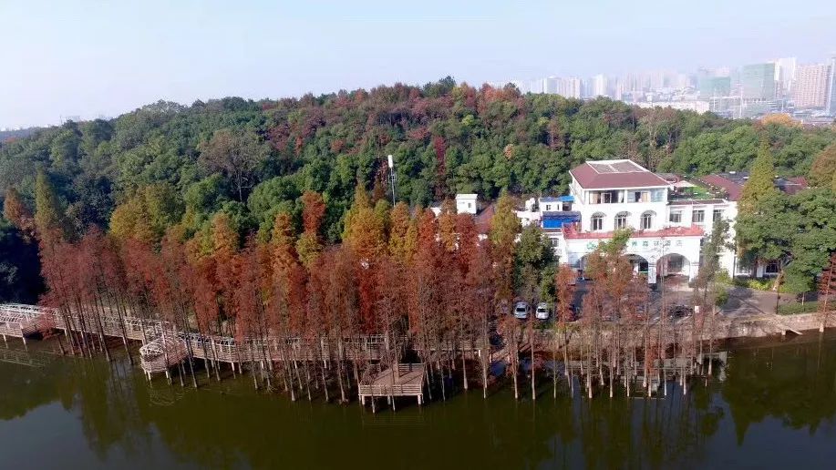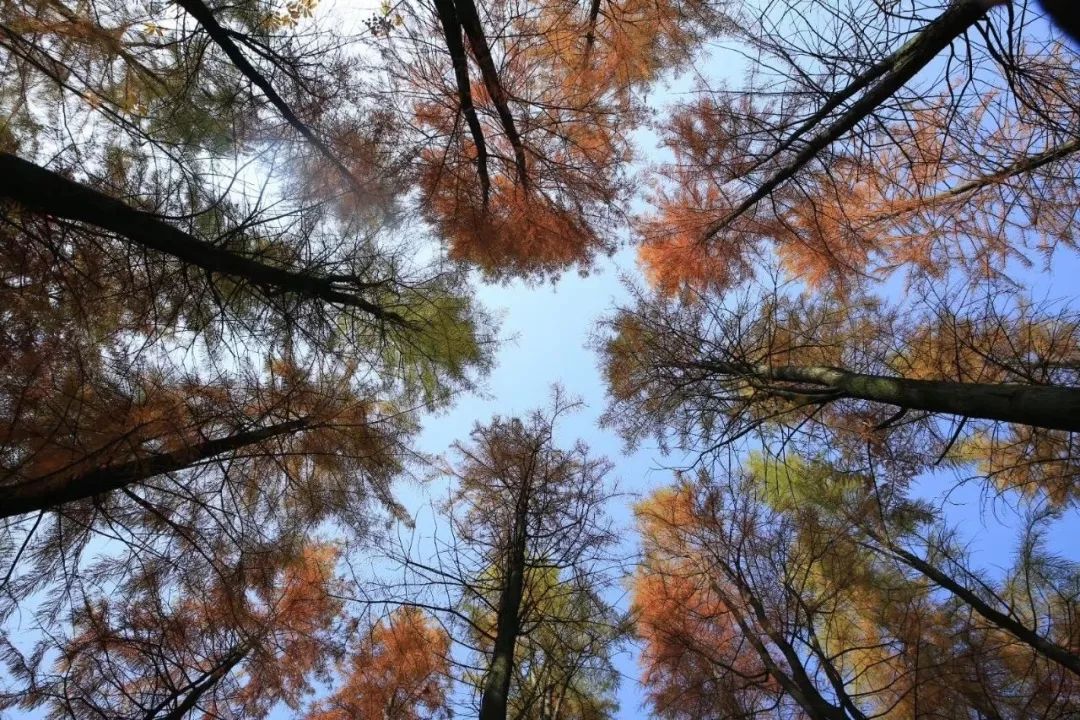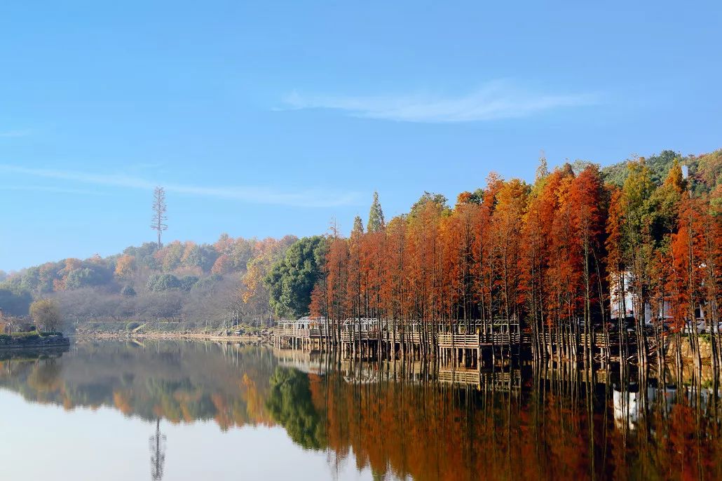 樱花湖畔池杉的叶片也变成了褐红色独具一格,和远处的彩叶林相互辉映,好似一幅色彩鲜明的油画。