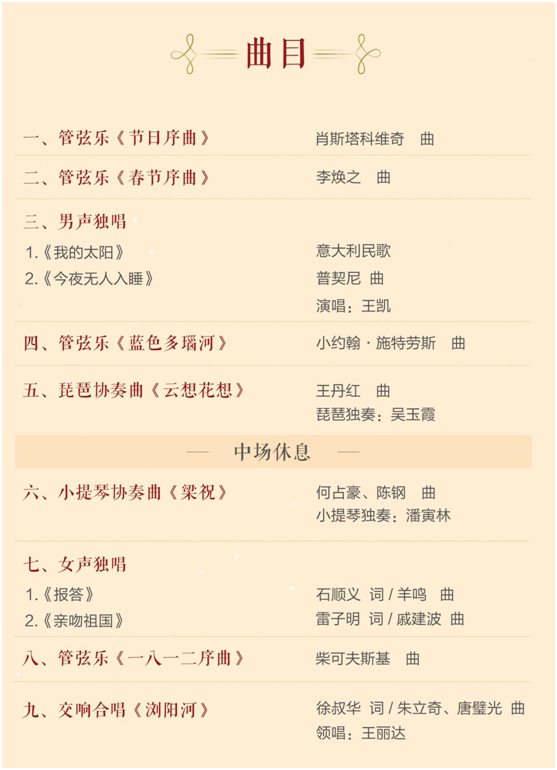 新年音乐会包括独唱、管弦乐、协奏曲、合唱。演出曲目充分体现了时代意义和长沙特色,既有柴可夫斯基的《天鹅湖组曲》、《1812序曲》,也有独具中国韵致、长沙特色的琵琶协奏曲《云想花想》、小提琴协奏曲《梁祝》、交响合唱《浏阳河》,既有耳熟能详的世界名曲《我的太阳》、《今夜无人入眠》,也有放歌时代的《江山》、《我爱你中国》、《报答》、《亲吻祖国》。