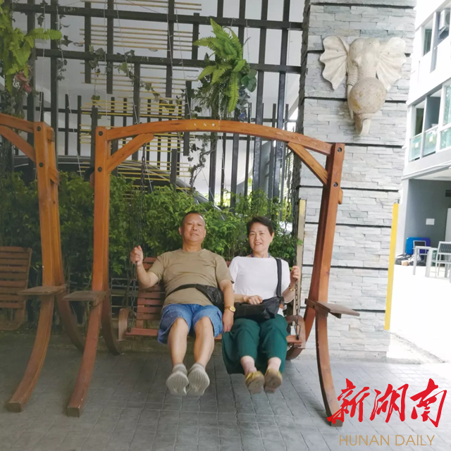 在泰国惬意的下午,夫妻俩荡起了秋千。