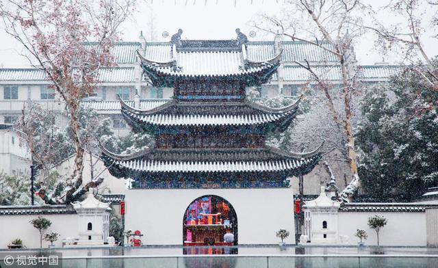 近日,江苏扬州、南京,湖北襄阳等地迎来降雪天气。2019年01月09日,江苏省南京市,夫子庙江南贡院,大雪纷飞。(图片来源:视觉中国、新华社)(来源:视觉中国、新华社)