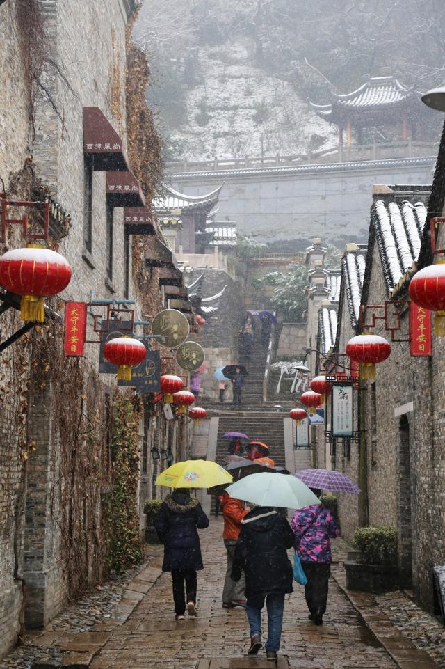 1月9日,游客在雪中游览江苏省镇江市西津渡古街。(来源:视觉中国、新华社)
