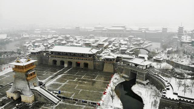 这是1月9日拍摄的雪中湖北襄阳唐城景区(无人机拍摄)。(来源:视觉中国、新华社)