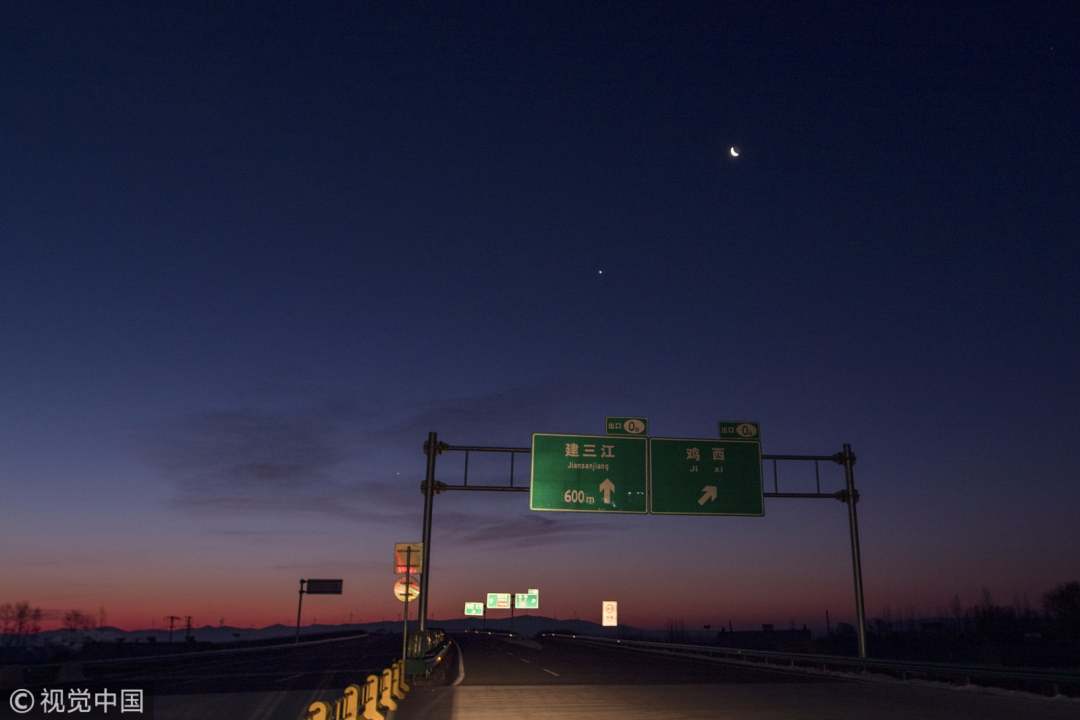 近日,启明星比太阳提早3个多小时升起在东方。我国各地观赏金星伴月,在日出前60分钟观赏最佳。图为1月1日,黑龙江鸡西,密山通往兴凯湖旅游高速公路上,东南方向的天空中,出现金星伴月天文现象。