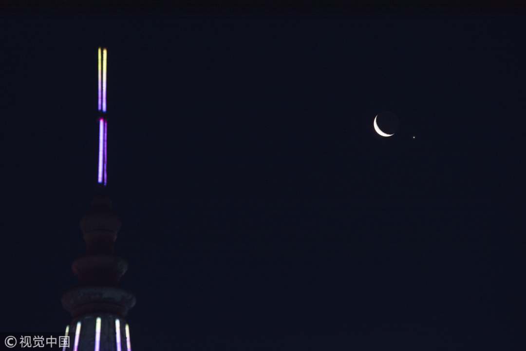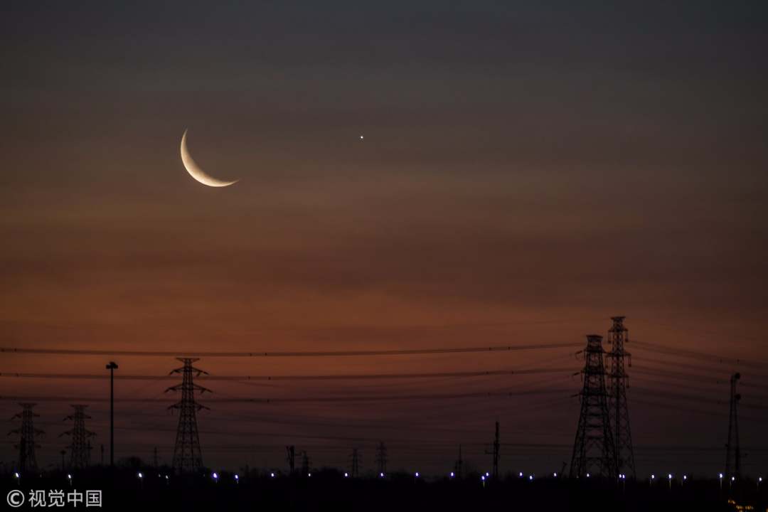 2019年1月2日凌晨,金星伴残月。进入2019年,天象绚丽多姿,令人大饱眼福。据广州市五羊天象馆透露,2019年有3次日食、两次月食、1次水星凌日和1次“超级月亮”等精彩天象登台表演。图为北京凌晨5:48,通州区运河大桥上空的金星合月。(来源:视觉中国)