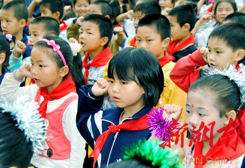 (6岁那年,陈瑛帮助庆迁顺利进入株洲枫叶学校,学杂费全免。2011年6月1日,庆迁加入少先队员。陈瑛/摄)