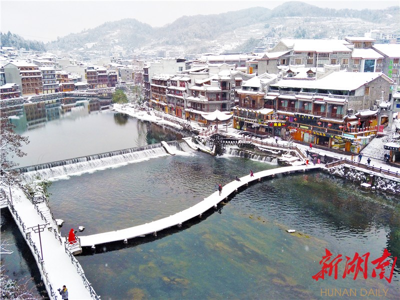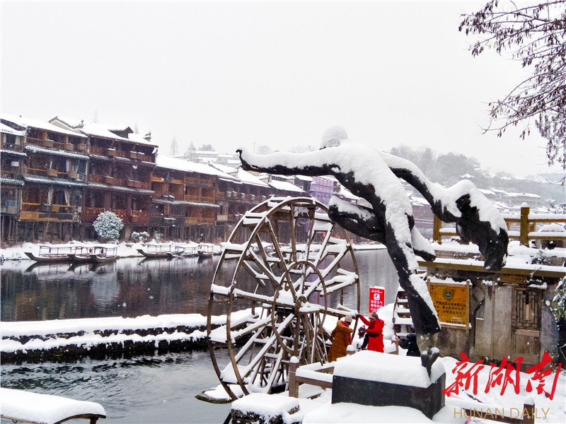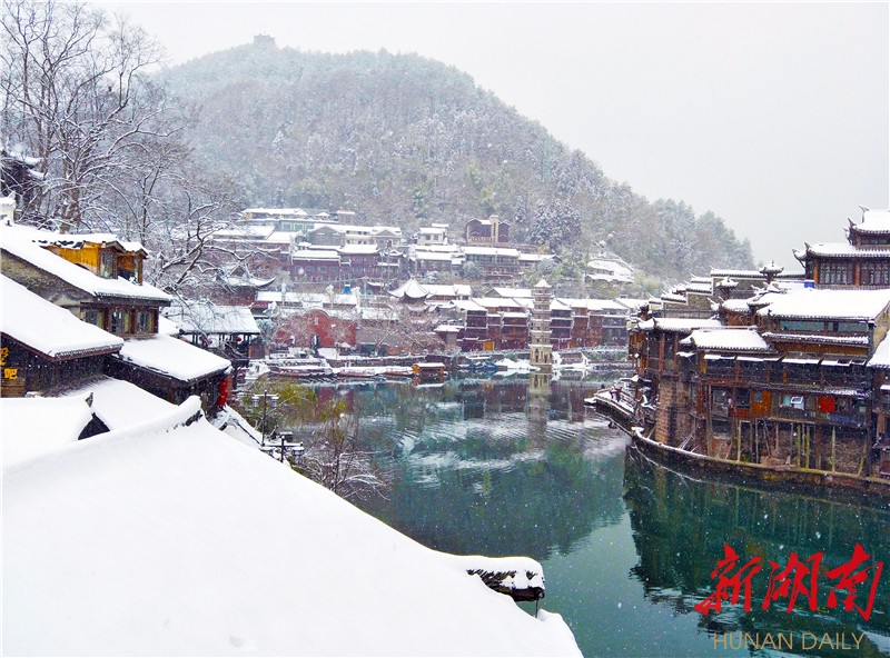 12月30日,湘西土家族苗族自治州凤凰古城被白雪覆盖,褪去往日青山黛瓦的热闹颜色,千年古城显得那么优雅恬静,别有一番风味。 摄影:麻正规
