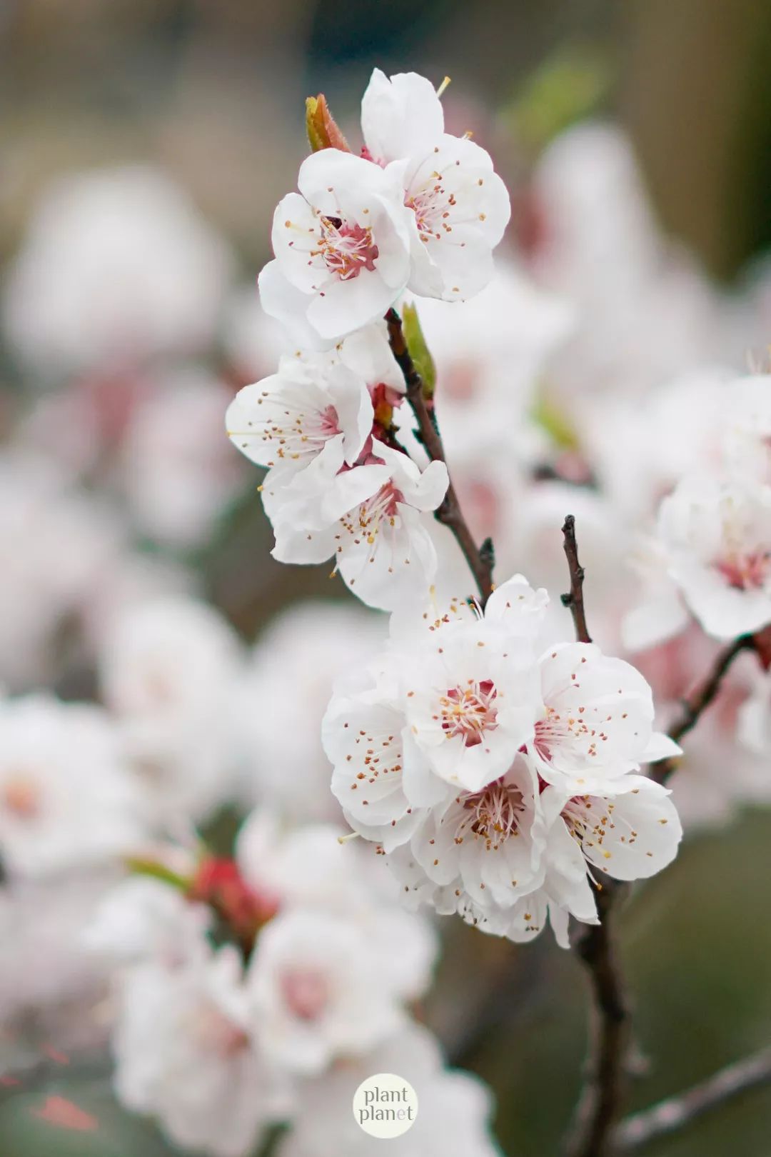 ▲ 杏花,白是第一个特征,常用来形容女子肤色,所以它这种白不是惨白,而是白里透红。它含苞的时候是微微的红色,随着盛开而逐渐变白,其花萼一直都是深红色的,连同枝条的颜色也是。认杏花还有一个硬指标,就是其花萼是往后翻的。