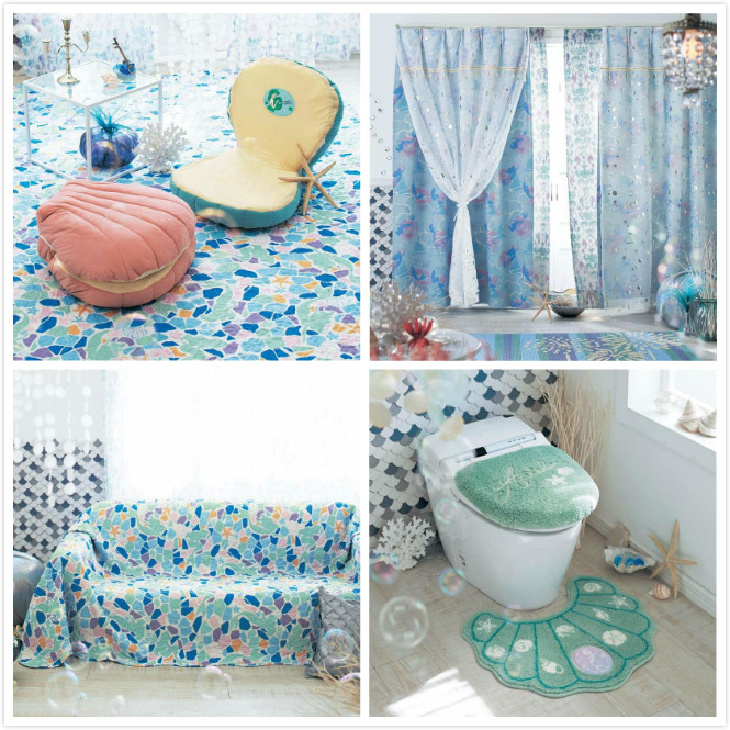 粉色与水蓝色“小美人鱼贝壳坐垫”为主打款,有两种“坐法”,合上和打开靠背的时候都可以坐。串珠装饰的海洋风格窗帘、碎石子图案毯子、浴室用的踏垫与盖套,都充满了海洋世界的风格。目前,这一系列梦幻又可爱的小美人鱼用品已经可以在Belle Maison官网购买了。而在此之前,它还推出过《美女与野兽》《白雪公主》款式的家具,都非常受粉丝喜爱。