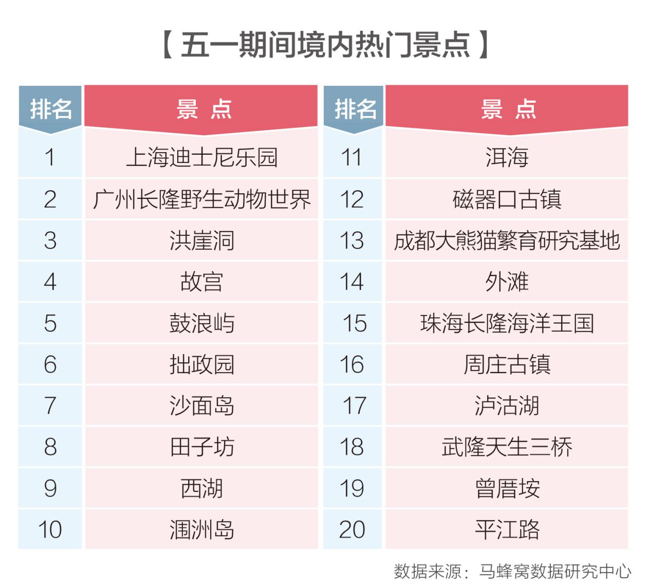 在境内的众多景点中,与文化创意产业结合紧密的主题乐园最受年轻游客关注。马蜂窝大数据显示,上海迪士尼成为五一小长假期间最热门的境内景点,排名第二的是广州长隆野生动物世界,重庆的网红景点洪崖洞热度超过故宫,排名第三。