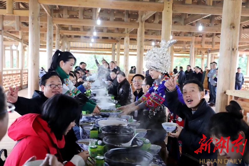 苗家的长桌宴上热气腾腾,游人享受到的不仅仅是美味的菜肴,更是苗家人的热情。