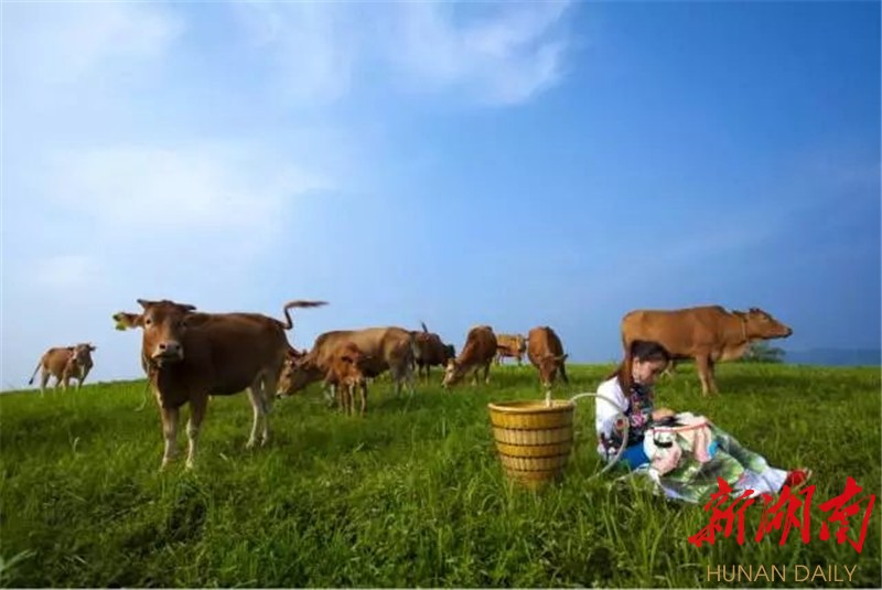 心灵手巧的阿妹在草地上绣着花,不远处的牛群正忙着吃草,二者相互独立,互不打扰,人与自然之间,似乎本该如此。