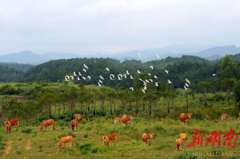 大地之上,黄牛三五成群,悠然自得;天空之下,白鸟众志成城,振翅翱翔
