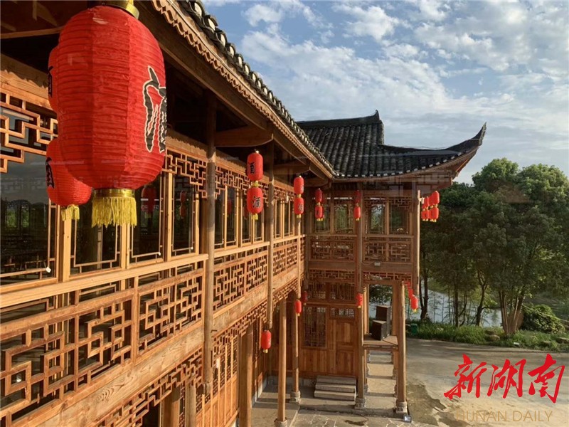 清澈的湖面倒映着蓝天白云,酒肆的灯笼像是顽童一般吊在屋檐之下,居高临下地眺望着这如画的美景。