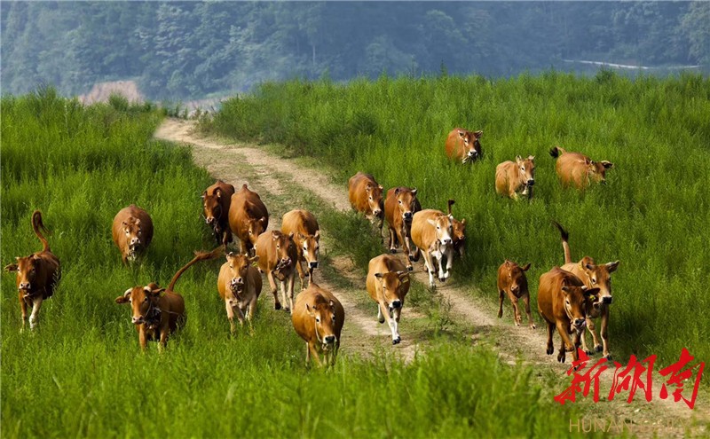 青青草地上黄牛健步如飞,彰显着生命的力量。
