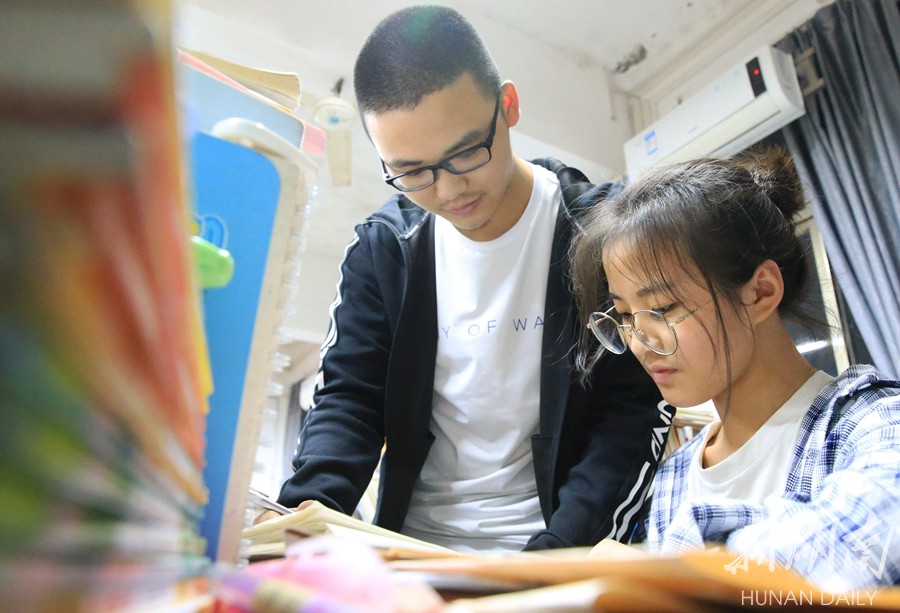 5月28日,衡阳县第一中学的高三毕业生在教室走廊看书交流。