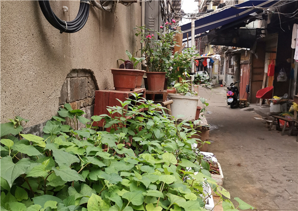 越靠近人民西路,老公馆越密集,只是大多都已人去楼空。这些老公馆的石库门仔细看却有细微差别,有些门框麻石厚重,更气派,有些只用薄薄的麻石凹出石库门的样子。到拐角处,一盆盆绿植映入眼前,这些盆栽不似别处供观赏的名贵花木,而是半边莲、紫苏、韭菜、朝天七彩椒、桑叶、薄荷等,有些甚至直接用自家废弃的脸盆或者菜碗、水桶培植。这些香辛料大多是既可观赏又可在做饭时随手摘取当佐料。