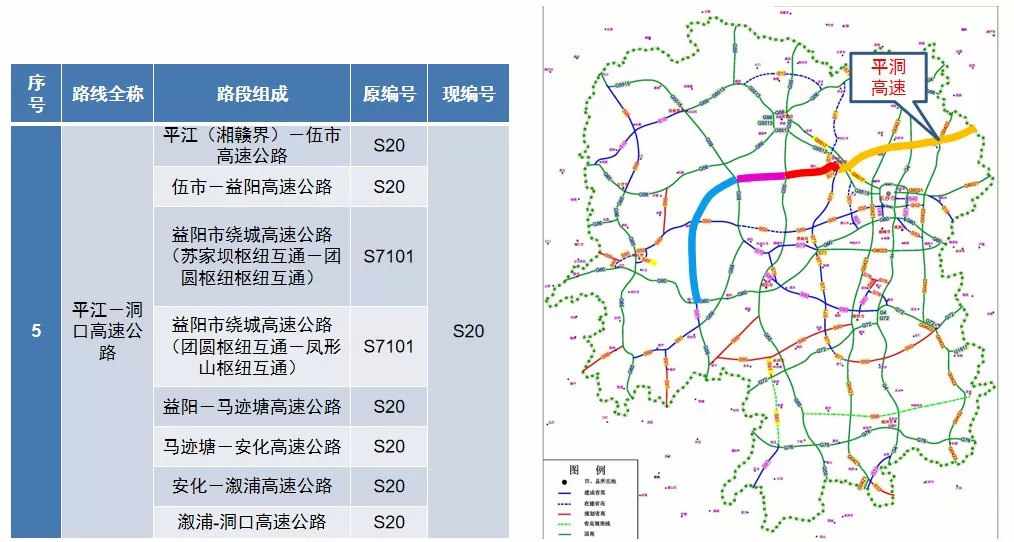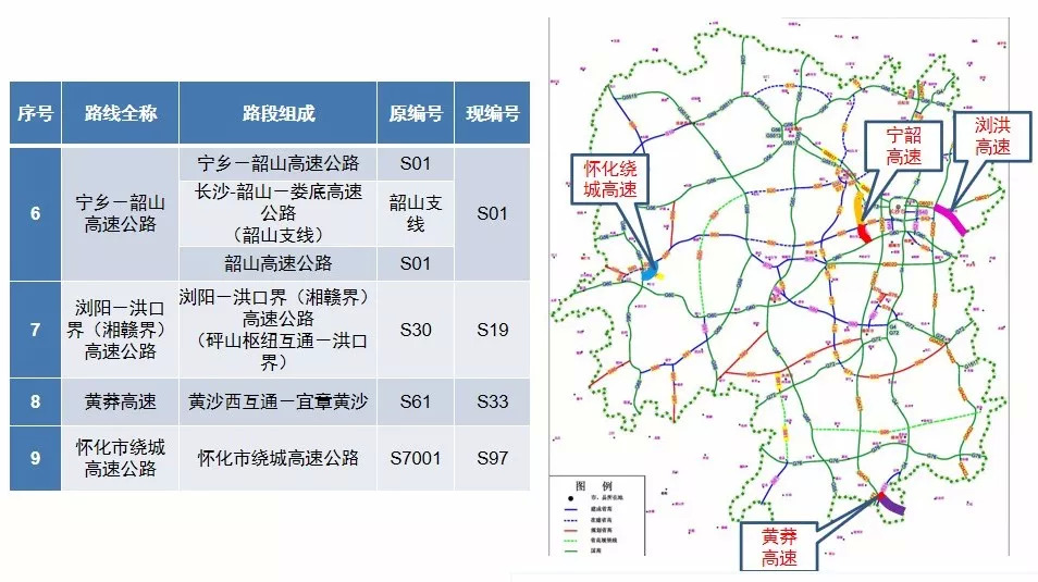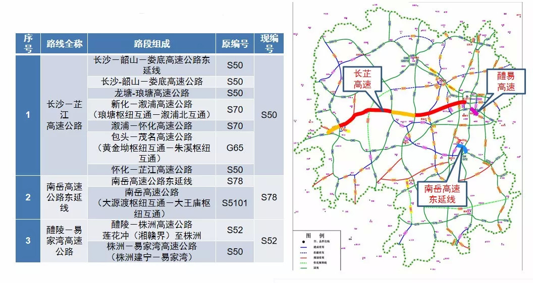 省级高速公路调整名单:S50长芷高速(长沙-芷江)、S78南岳高速东沿线、S52醴易高速(醴陵-易家湾)、S71华常高速(华容-常宁)、S20平洞高速(平江-洞口)、S01宁韶高速(宁乡-韶山)、S19浏洪高速(浏阳-洪口界)、S33黄莽高速(黄沙西-宜章)、S97怀化绕城高速。