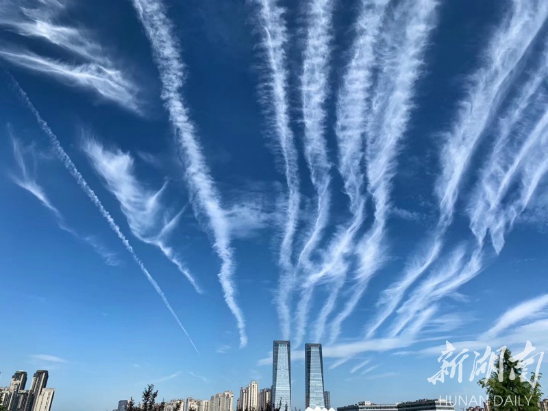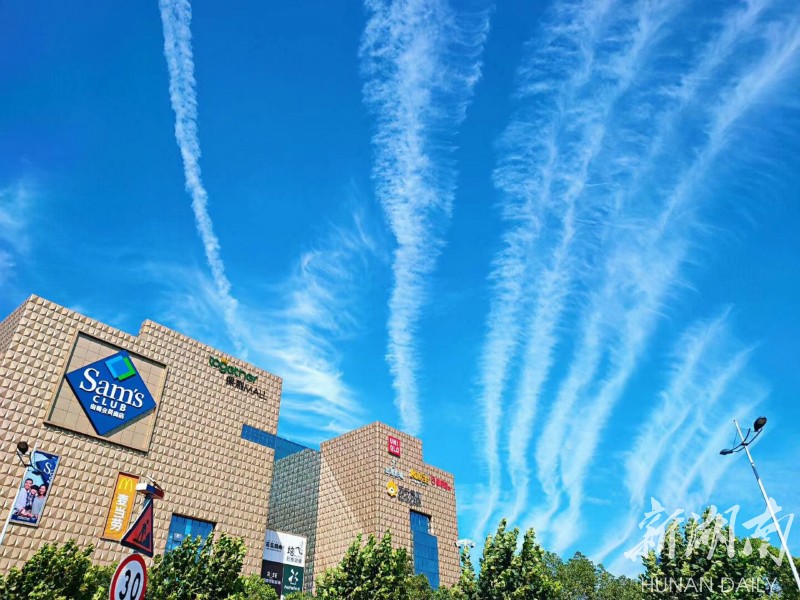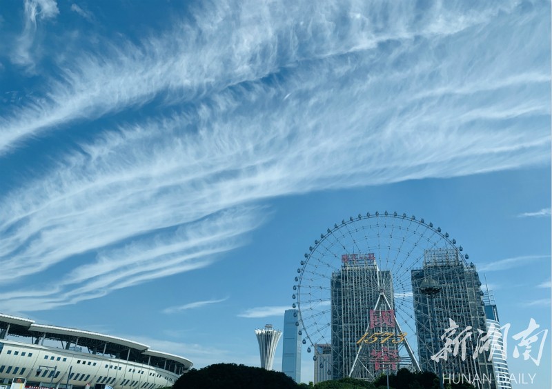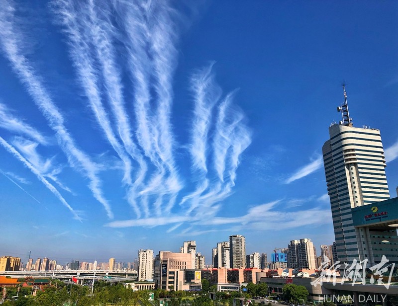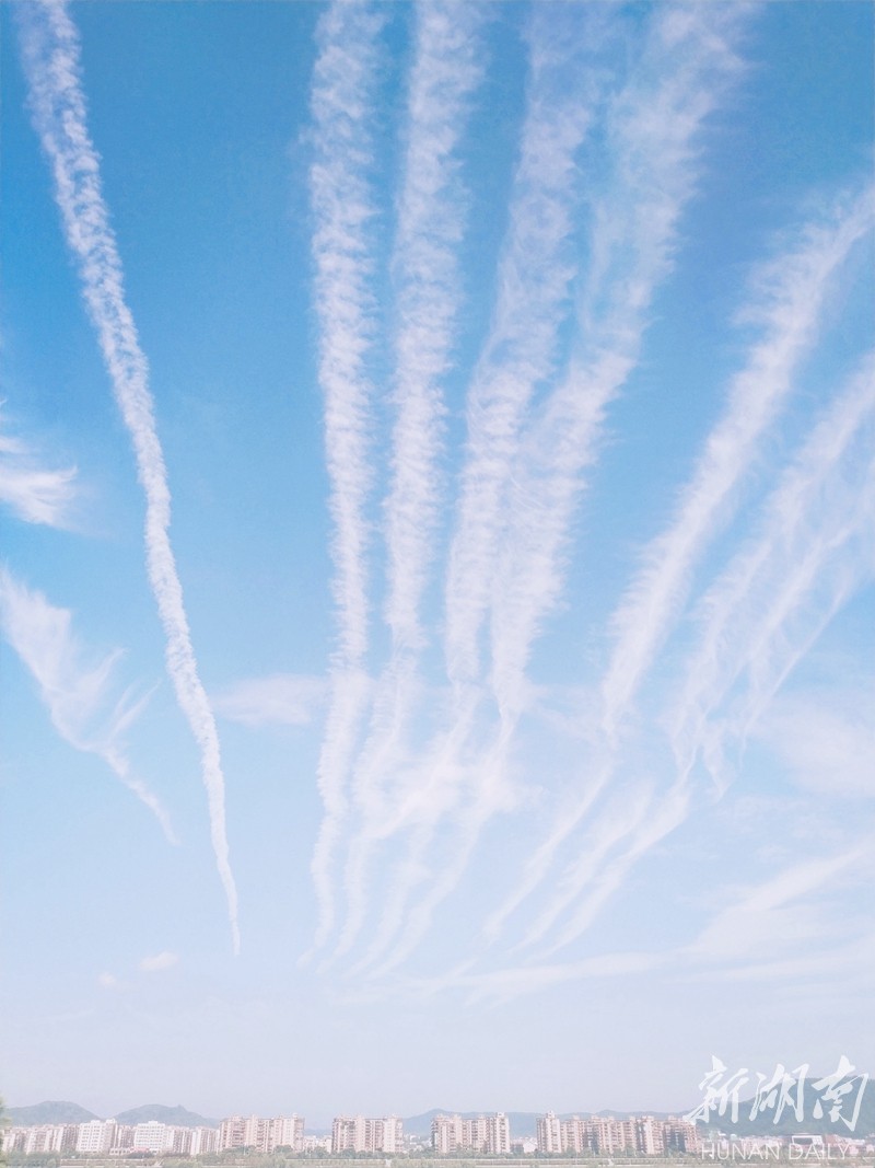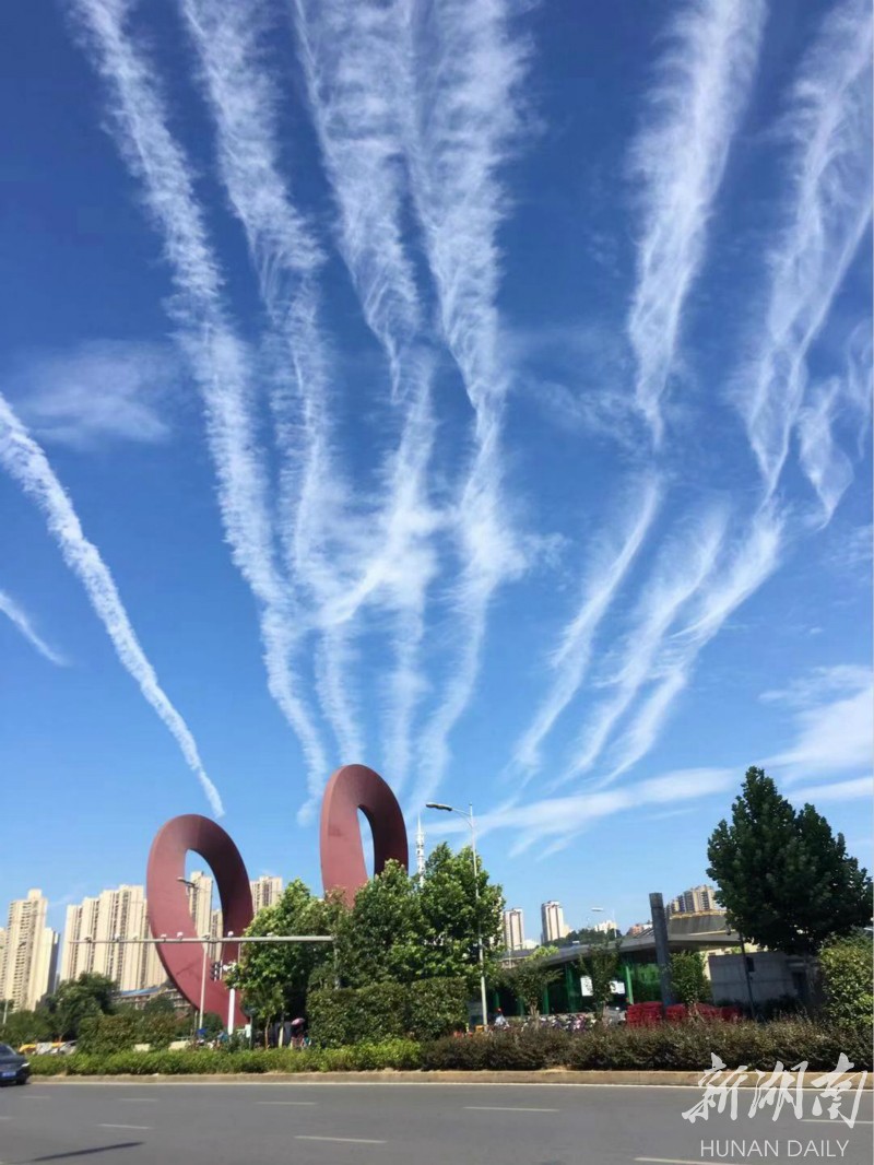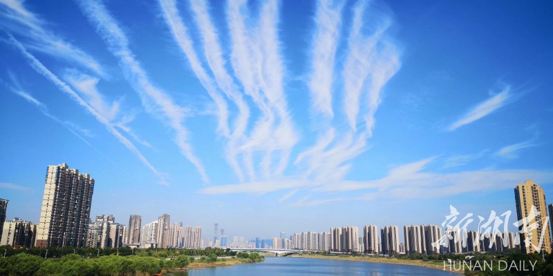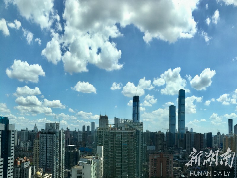 抬头可望长沙穹天湛蓝,白云皎洁。整座城市都被这碧空包围。 刘洋 刘书宏 摄 The magnificent sky encircles Changsha city, (Photo by Liu Yang, Liu Shuhong)