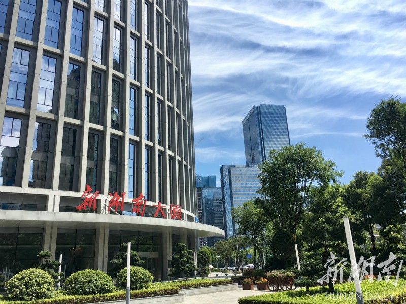 新湖南大厦在蓝天白云的衬托下气势恢宏。 刘洋 刘书宏 摄 The New Hunan Building stands with pride under the blue sky and white clouds. (Photo by Liu Yang, Liu Shuhong)