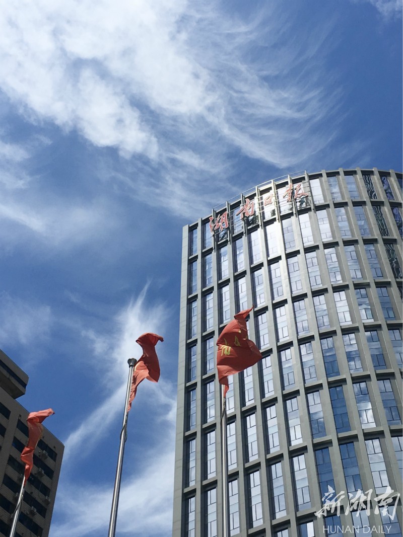 蓝天白云下,湖南日报社门前红旗招展。 刘洋 刘书宏 摄 Under the blue sky and white clouds, the red flag in front of Hunan Daily dances jubilantly. (Photo by Liu Yang, Liu Shuhong)