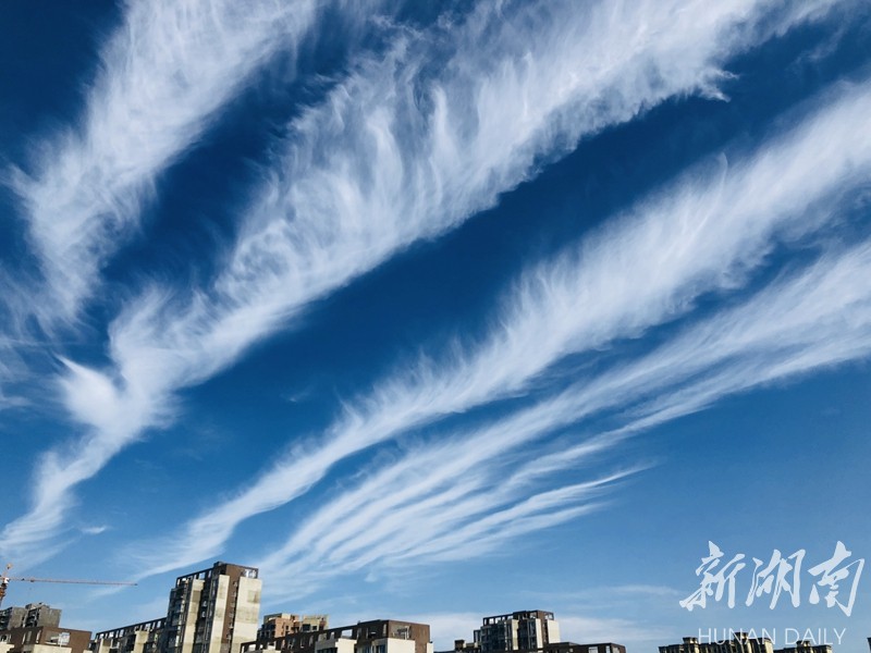 长沙蓝天里,飘起了一缕缕长练一般的白云。 云水 摄 The clouds flutter like silky ribbons in the sky of Changsha. (Photo by Yun Shui)
