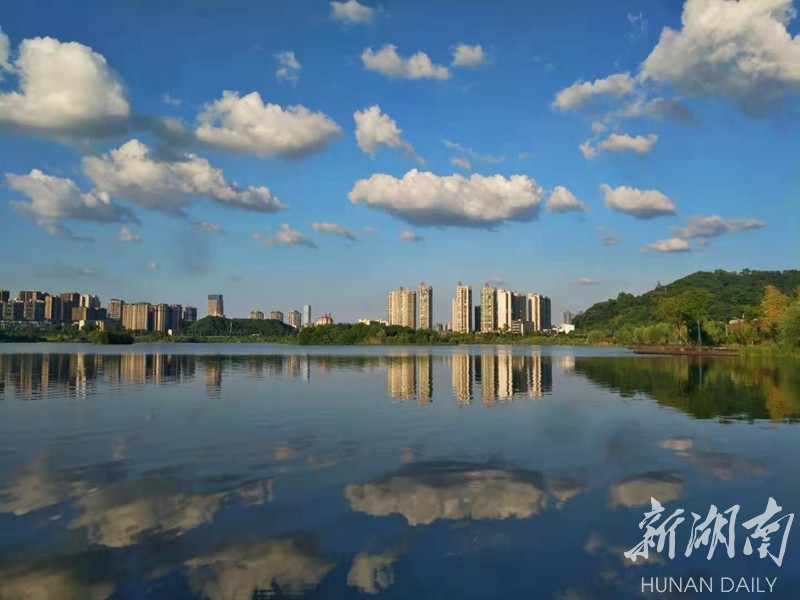 蓝天白云倒映在湖水中,相映成趣。 湖南日报记者 郭立亮 摄 The glimmering lake reflects the sky and clouds like a mirror.(Photo by Guo Liliang,Hunan Daily)