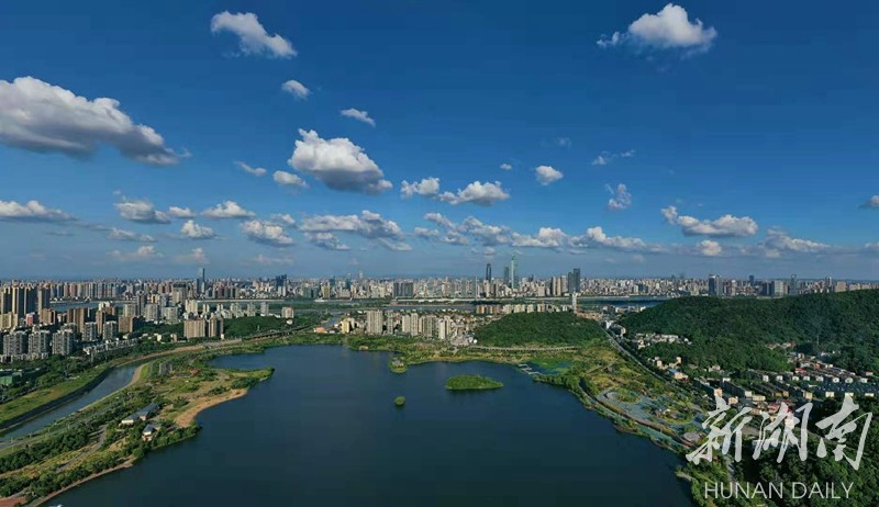 蓝天白云下的西湖公园,越发清新美好。 湖南日报记者 郭立亮 摄 The Xihu park appears more attractive with the contrast of blue sky and white cloud above it. (Photo by Guo Liliang, Hunan Daily)