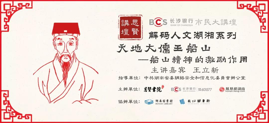 8月25日(本周日)下午2:30,长沙图书馆217新时代学习讲堂,思贤讲坛解码人文湖湘系列讲座第八讲,特邀深圳大学文学院哲学系教授、博士生导师王立新老师,带您走进“天地大儒王船山”的精神世界。