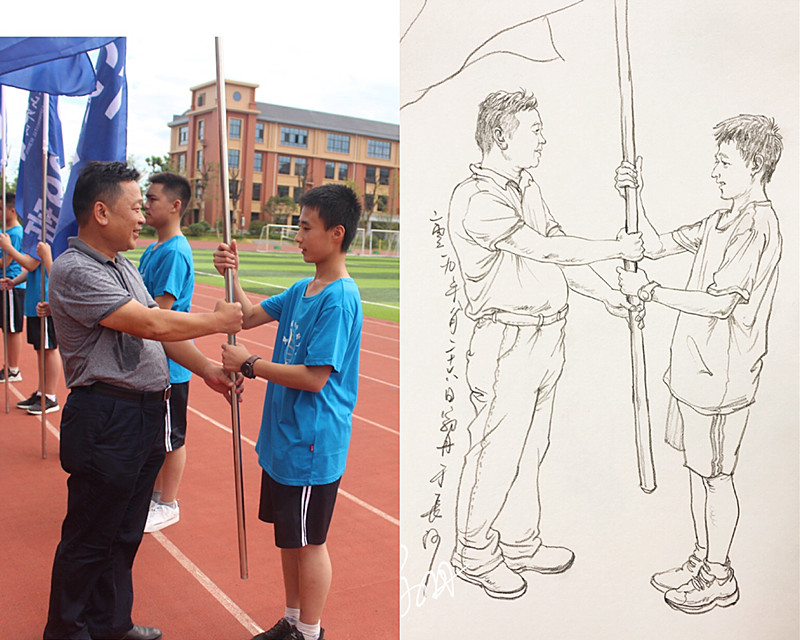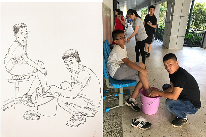 如果说“累并快乐着”是孩子们对军训最直观的感受,那老师们的感受又是怎样呢?“累并感动着。”长沙市麓山外国语实验中学团委书记翁丹说:“这次学校的初一新生军训活动我全程同行,我一直在想着怎样才能更好地记录孩子们的军训生活,直到这个画面感动了我: 新生报到的那天,一个父亲因为孩子扭伤了脚,那种焦急又无奈,只能连忙拿着冰矿泉水给孩子敷脚。”翁丹告诉记者,由于自己是美术老师,出于爱好和职业的习惯,便从心底萌发出一定要把他们描绘下来的想法。接下来就是一幕幕的故事。每一幅画后面,都有一个小故事,或感动,或幸福,或震撼,或温馨......不知不觉,已经画了30多幅了。