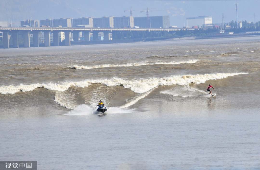 2019年9月16日,杭州,农历八月十八,一年一度的钱塘江大潮景观,吸引了不少市民沿江观看。和往年一样,有国内外冲浪队在潮头“弄潮”。(来源:视觉中国)