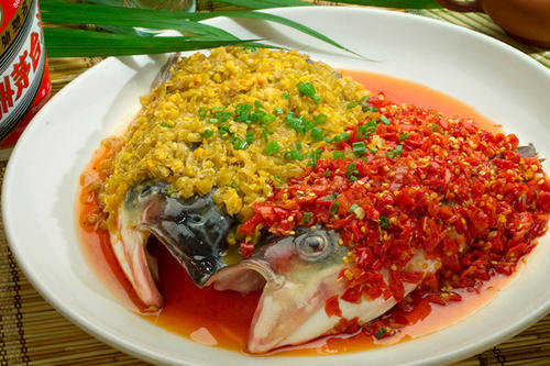 剁椒鱼头是湖南湘潭以及湘赣交界地方的一道传统名菜。以鱼头的“味鲜”和剁辣椒的“辣”为一体,风味独具一格。菜品色泽红亮、味浓,蒸制的方法让鱼头的鲜香被尽量保留在肉质之内,剁椒的味道又恰到好处地渗入到鱼肉当中。