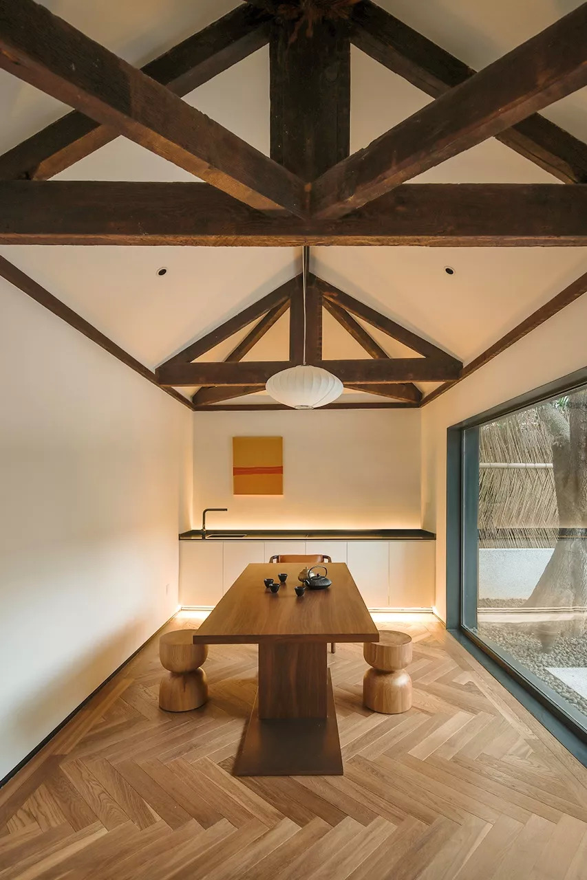 院子里废弃的杂物间,大概有十几平米,里面的木材已经完全腐坏了。我们把堆放在里面的垃圾清除,重新加固木结构,做了一整面落地窗,变成了一个与庭院对望的明亮茶室。
