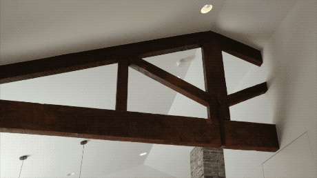 我们保留了整个房子的屋脊线,与室外的坡屋顶相呼应。刻意在客厅跟餐厅之间保留了一根伞字形的木梁,这是德式建筑的最大特色。