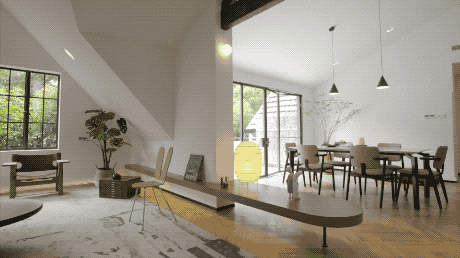 这个房子最大的特点是被一大片绿色包围,我们拿掉了客厅跟餐厅之间的隔墙,让整个房子变得更加通透、明亮,整个二层的公共空间就像一个空中花园。
