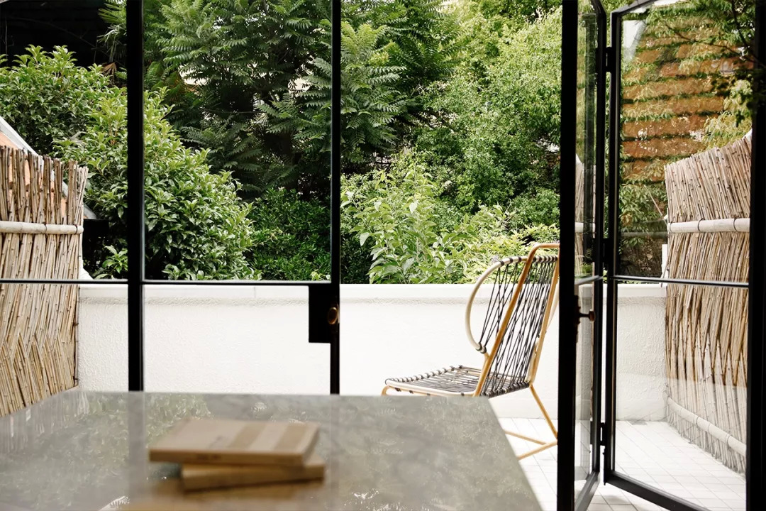 露台区域,原来有一个90公分的高台,我们把台子拿掉,木门窗更换成落地的钢窗折门,折门全部打开的时候,能看到外面的桂花树、香樟树、杨梅树、柿子树,还能听见风声和鸟叫声。