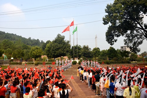 湖南日报·新湖南客户端9月16日讯(通讯员 梁天胜 何粤 蒋芳英)“我和我的祖国,一刻也不能分割,无论我走到哪里,都流出一首赞歌。”9月16日早上,江华瑶族自治县大石桥乡中心小学升旗仪式上,1000余名师生合唱《我和我的祖国》,用歌声表达祝福,庆祝新中国70华诞。