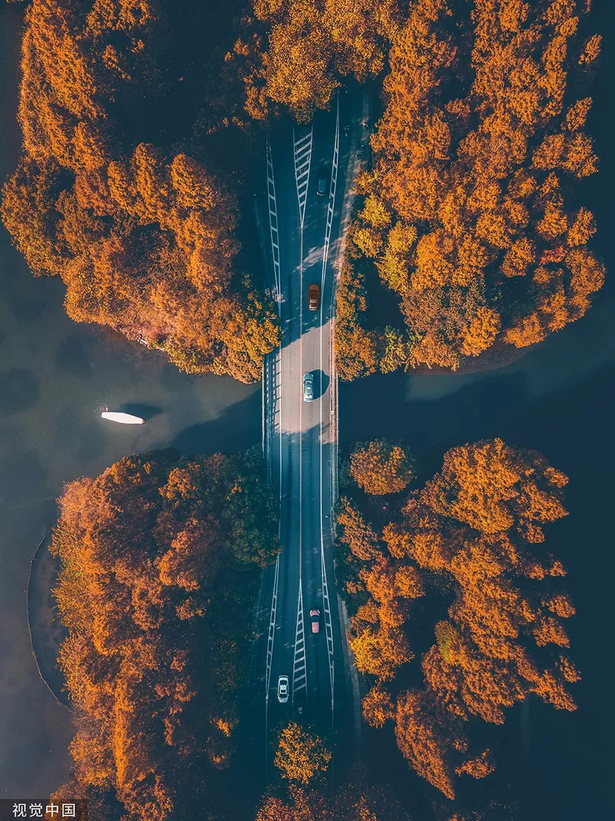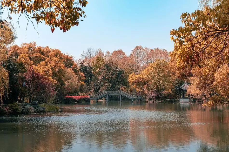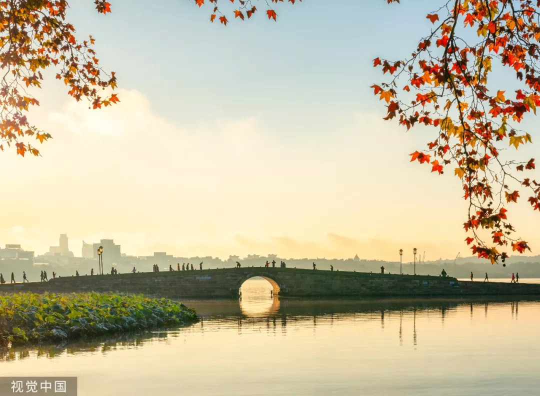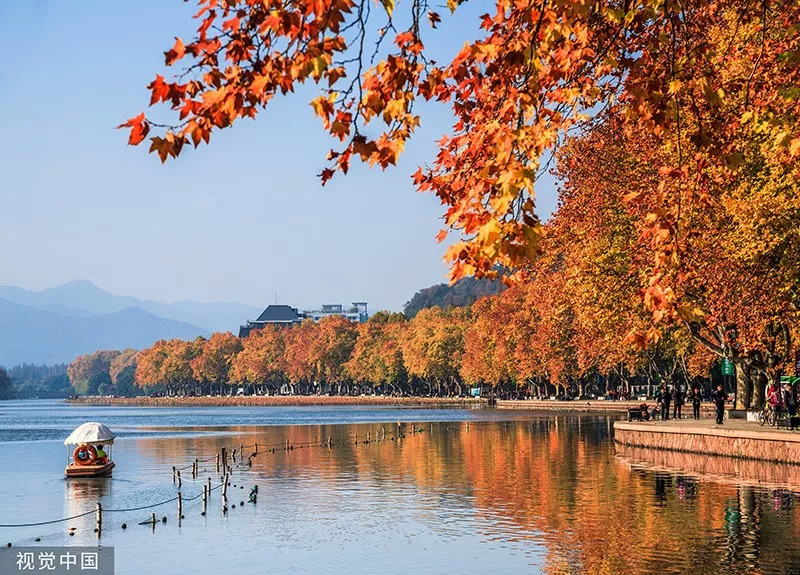 梧桐绕着长堤,平静无痕的秋水倒映着霞光,远处的青山重重,近处的黄叶婆娑,杭州美成了画里的江南。