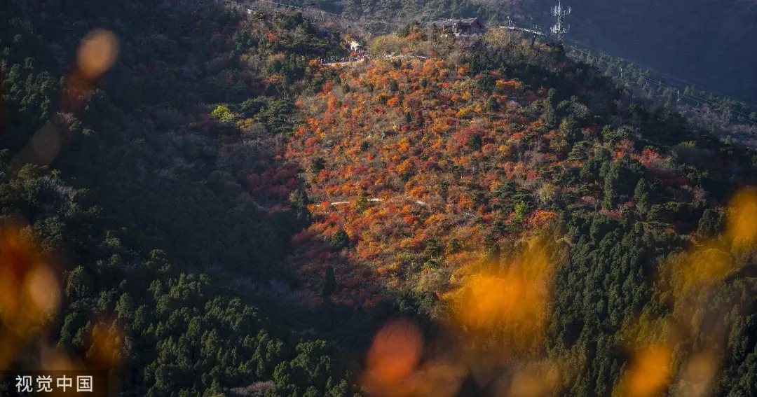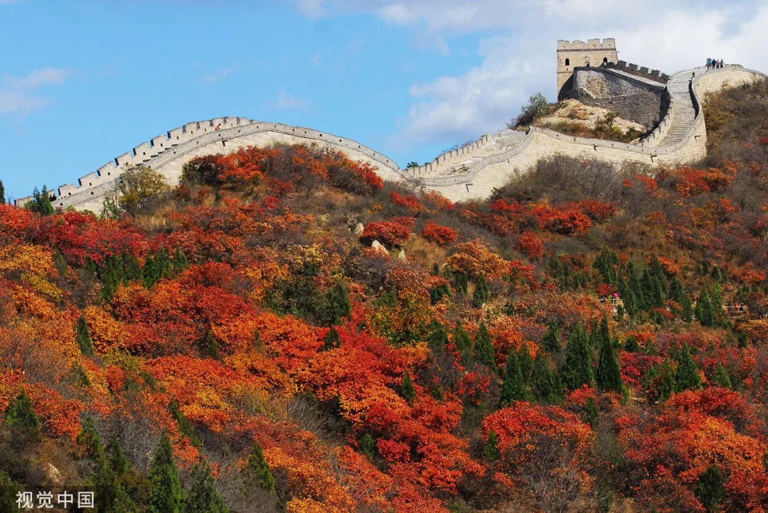 如果说香山的红叶是绚烂多彩的,站在长城眺望,则有一种苍茫感,瑟瑟秋风中,山上的红铺陈而下,蓝在天上,红在脚下,你可以看见天地的气势。