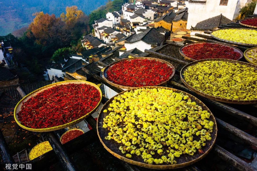 江南的秋,在杭州是文人气韵,落在篁岭,则是一番热闹、丰收的景象。 挂在山崖上的篁岭古村,有独特的迎秋仪式,辣椒、玉米、稻谷、皇菊……晒满屋顶,暖阳下,是秋色,也是一年劳作的成绩单。