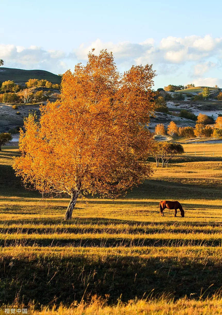 牧人们赶着成群的牛羊,马儿在树下停歇,秋天在乌兰布统像一条宽阔的大河,它静静的流淌,广袤开阔,让人心情舒畅。