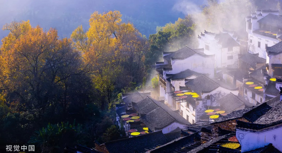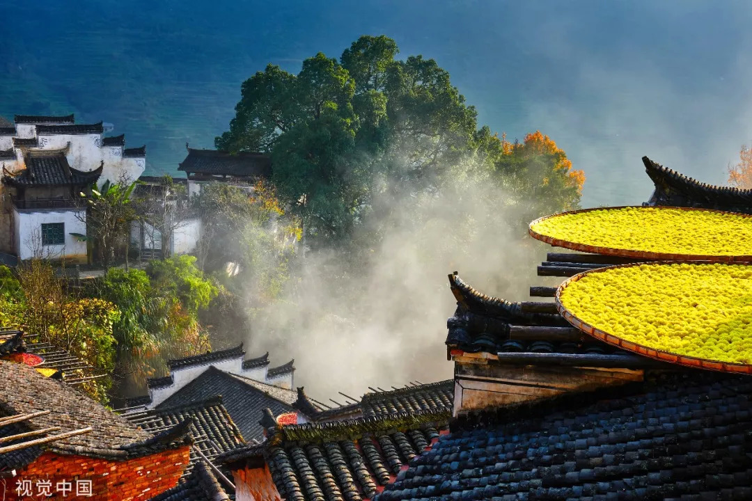 秋天去篁岭走一遭,看晨曦的日光穿过山中的薄雾,蓝天下,农民们以粮食作画,绘出一幅幅中国独有的秋景图。