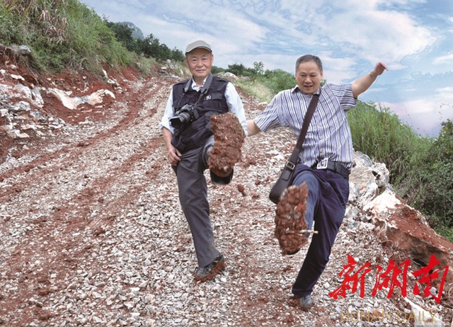 2010年,唐湘岳和父亲唐大柏在溆浦一石漠化严重的山坡采访,每走一步鞋底就增加一层泥石,父子俩步履艰难,相互支撑。