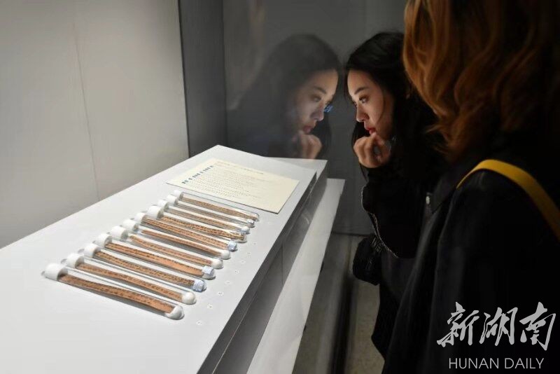 11月10日,湖南省博物馆,市民在欣赏简帛书法艺术。当天,由湖南省文化和旅游厅主办,甘肃简牍博物馆、湖北省博物馆等单位协办的“千年遗墨——中国历代简帛书法展”开展。展览免费向公众开放,展期将持续至11月30日。 湖南日报记者 田超 龙文泱 摄影报道