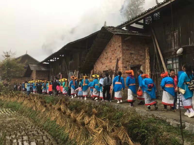 第二天“转战”到隆回县虎形山。如果说“奇装异服”是很多旅游区给当地民俗表演者的一种刻意标配,那么我们在瑶族乡崇木凼看到的满寨子人着盛装去给一家乡亲道“三朝”喜,则完全是一场偶遇的本色出演。在满坡参天古木的映衬下,一只浩荡队伍头戴红黄相间山花般的圆盘无顶帽,上身穿瓦蓝无领对襟衫,女人穿白色刺绣镶红边统裙,腰系红黄蓝杂揉彩带,绵延于村落与稻垄间,长达一里多路,真是蔚为壮观,古风浓烈。与后来几个着同样服饰但大方老练的景点表演者比,这里的阿婆阿嫂竟羞与陌生人合影,眼角眉梢里贮满朴实敦厚,更能给人带来一种生命初乳般的内心冲击。