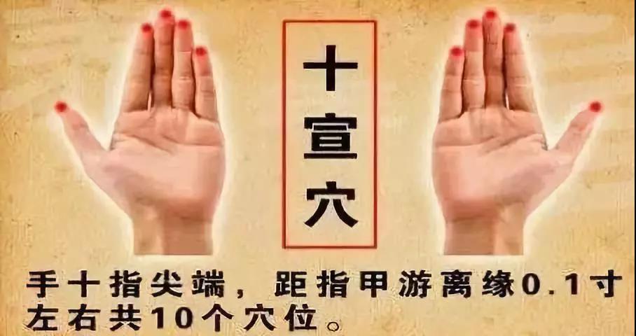十宣(在十指尖端,去爪甲一分,双手共10穴)。两手交换,一手拇食指岔开,一指一指挨着捏压两侧,10指共捏2—3分钟。